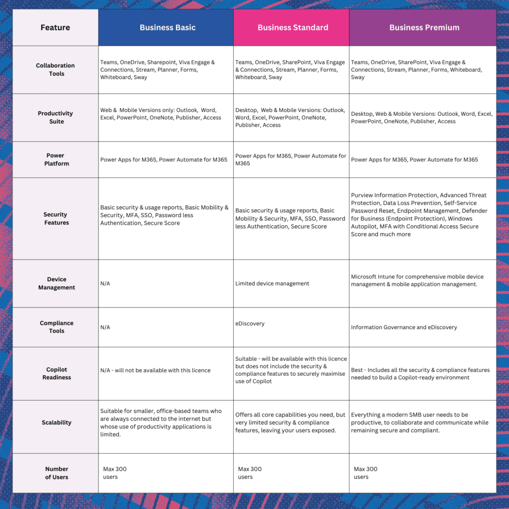 This is another example as to why choosing the right Microsoft 365 licence for each user is important. Still, with everything else on your plate and the constant feature updates, it can be difficult to feel truly comfortable that you’ve made the right and most impactful choice, relative to your investment. So, let’s take a look at each licence and once you’ve read this segment, you should have a foundational understanding of each of the core licences available to you and why they may or may not be the right choice. Each licence noted below is available for up to 300 users.